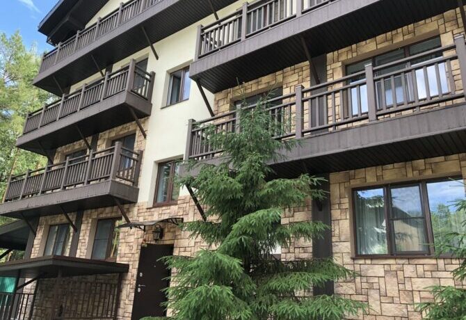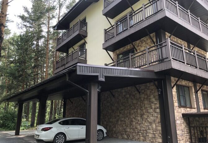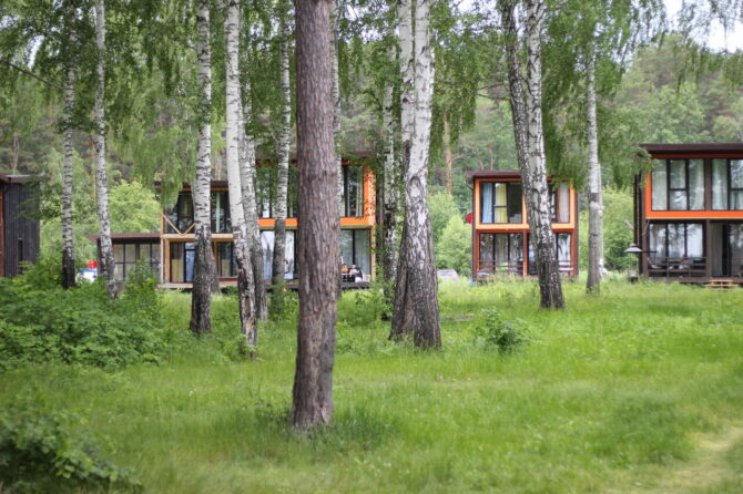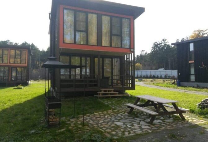 This complex consists of modern two-storey chalets built in the Scandinavian style. Each of them is designed to accommodate 8-10 people. The house has several bedrooms, kitchen, common living room, bathroom with shower, veranda. There is a barbecue on the street. Separately there are covered gazebos with braziers. A sauna has been built on the territory.