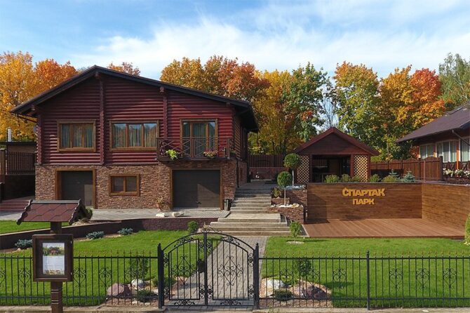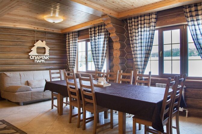 Recreation center “Spartak Park” is a cozy guest house with seven amenities, located on the shore of a forest lake. Large companies like to come here and have fun on holidays and weekends. At their service – karaoke right in the house, a wide selection of board games, sauna, barbecue areas at each cottage,a warm banquet hall with outdoor service. The houses are designed for a different number of residents – from 8 to 22 people. In the yard there is a children’s playground with a slide. In winter, cross-country skiing trails are laid in the district, a sports equipment rental point is opened.