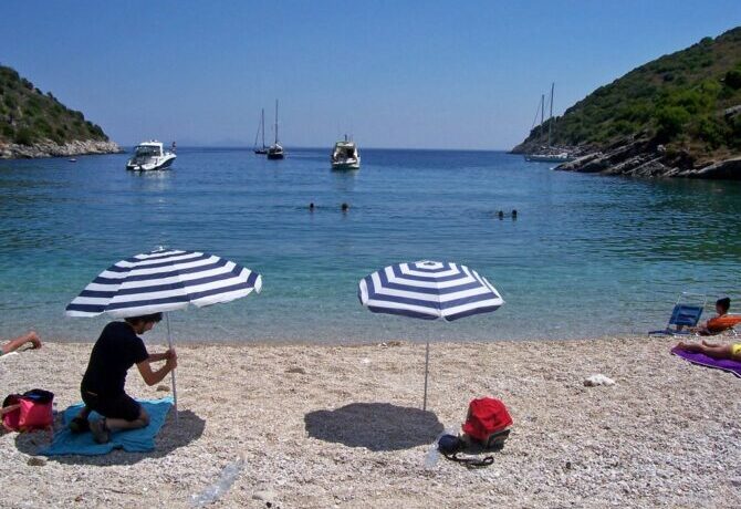 Egremni Beach is not too crowded beach. Here you can see girls sunbathing “topless”. The eastern part of the beach is distinguished by a sharp entrance to the sea with a deep bottom, so in this part there are almost no tourists with children. High waves roll up to the shore, it is recommended to swim here only for those who do not doubt their ability to swim perfectly.