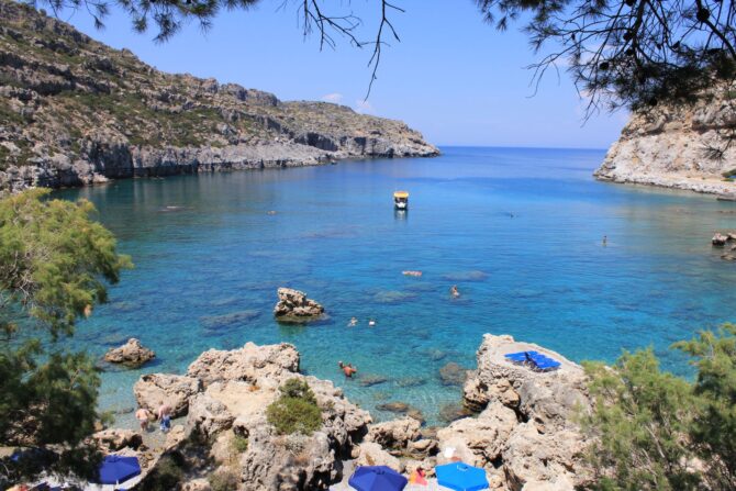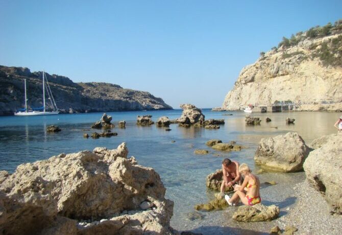 Cozy Anthony Quinn Beach is especially popular with vacationers. It is located in a quiet Bay, and the most convenient way to get here is from the town of Faliraki, which is 4 km away. The coastline is curved in the shape of an arc, and a high cliff rises above the beach.