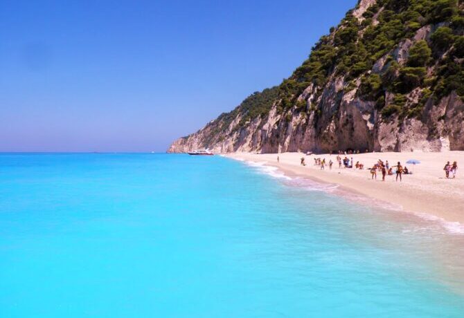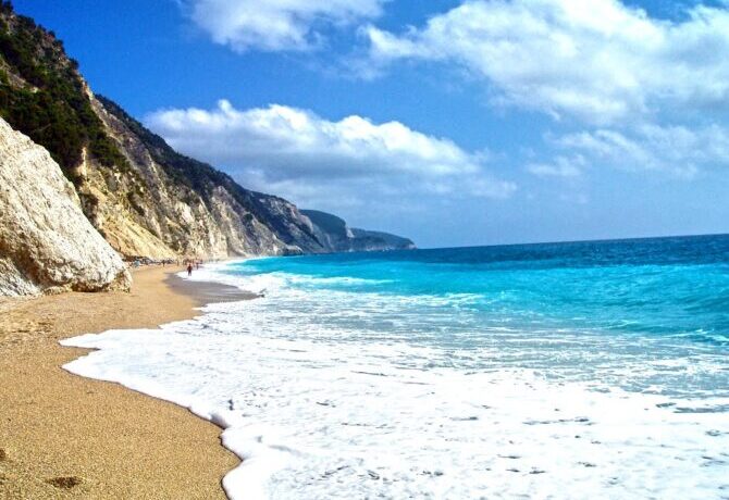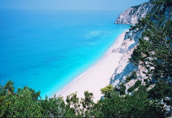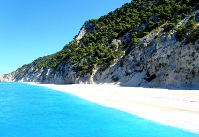 One of the most beautiful and mysterious beaches of the island of Lefkada. It attracts vacationers with a warm sea of emerald-azure color and pleasant to the touch small white pebbles. Over Egremni Beach hang high rock cliffs, which do not allow to organize on this beach the construction of bars and cafes. Leaving the car in the car park, tourists will have to go down to the beach, overcoming a long staircase of 350 steps.