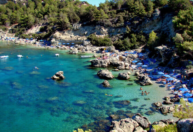 Faliraki is a paradise and the most famous beach in Rhodes. It stretches for 4 km along the coast, is divided into small areas, among which there is even a beach designed for nudists. In peak high season, the beaches are very crowded and noisy. For the entertainment of tourists there are all kinds of attractions, rental of equipment for water sports, various bars, taverns and shops.