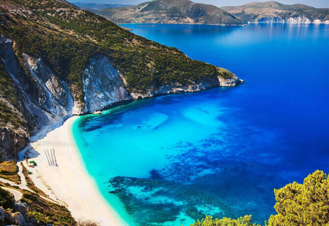 The famous Myrtos Beach is located in the western part of the island of Kefalonia. It is comfortably located at the foot of two mountains – Agia Dinati and Calon Oros. It is rightly considered one of the best beaches in Greece, which is regularly awarded the Blue Flag. Myrtos is curved in the shape of a crescent, and light waves with snow-white foam are nailed to the shore.
