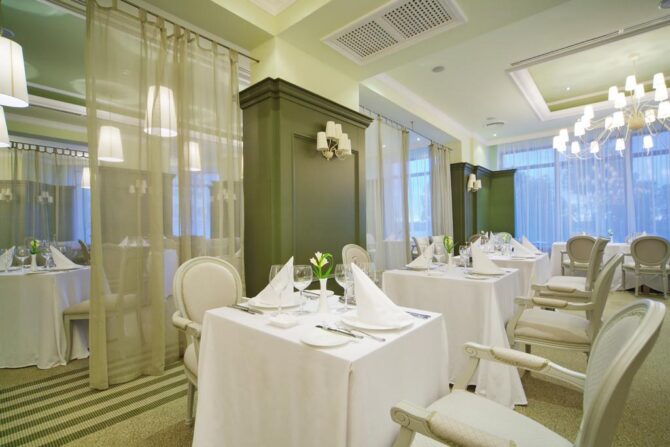 In one of the gourmet restaurants, which is often mentioned by guests in their reviews, they serve unique food prepared according to authentic Russian recipes. This is a real paradise for those who like to eat deliciously in good company, complementing their delight with cool French wine. For cooking, only high-quality products grown on special farms are used.