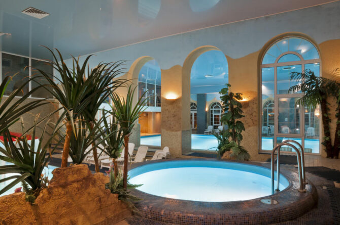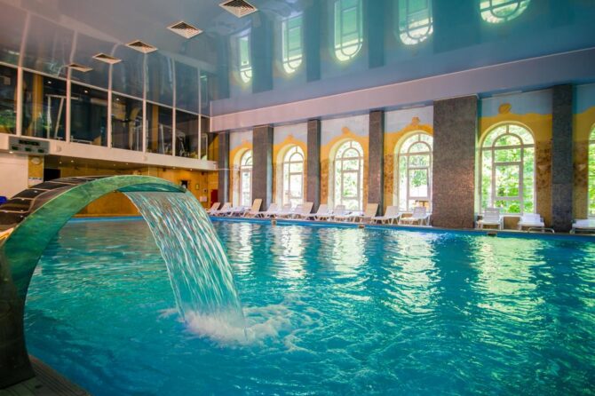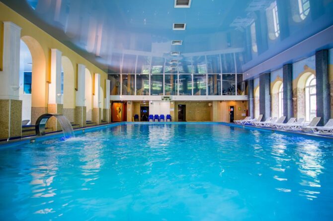 On the territory of the complex “Mistral” daily works wellness center, offering a range of services. At your disposal is an indoor heated pond, there is even a small pool for children. The room is equipped with sun loungers and sun loungers so that you can swim and relax with complete comfort.