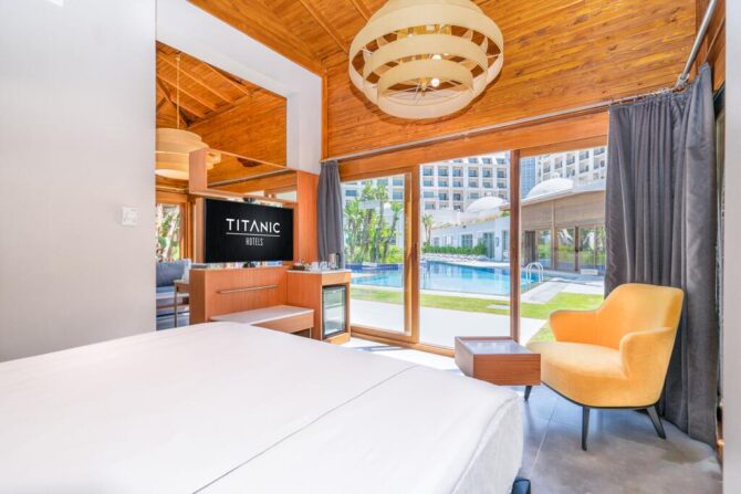 Titanic Deluxe Golf Belek Hotel is located in Belek, Kadriye, on its beach which can be reached by boat, about 6 km from the centre of Belek and about 25 km from Antalya Airport.