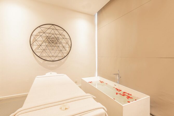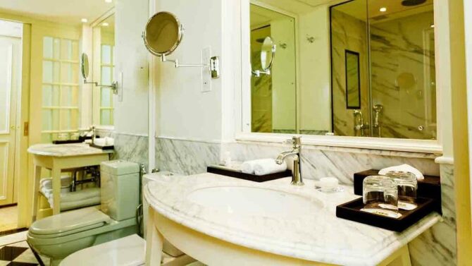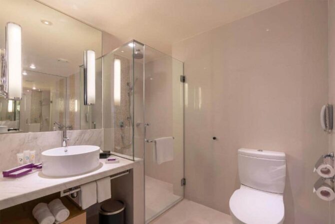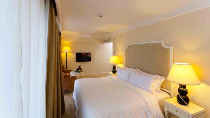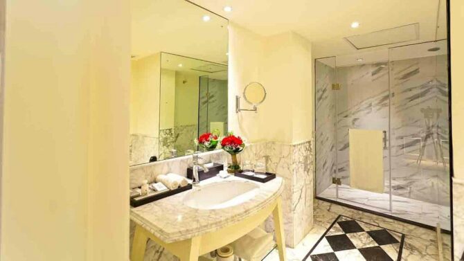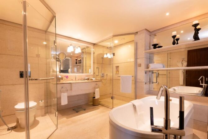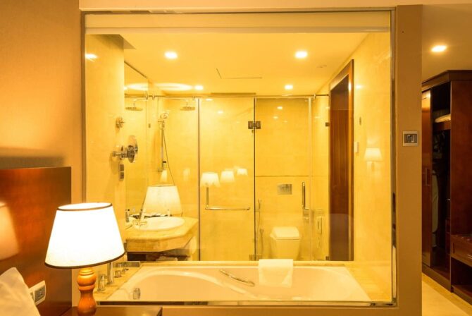 - Suite: 79-137 square meters. meters (you can find a two-bedroom option), 65-inch TV, bathroom (again, with transparent walls).