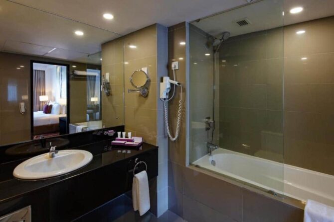 - standard: single or double rooms of 35 square meters with a 50-inch TV and a bathroom with transparent walls;