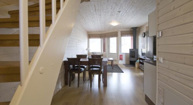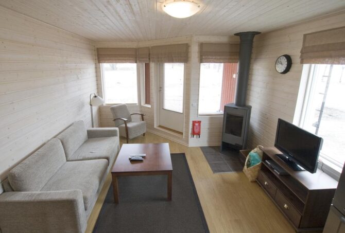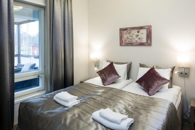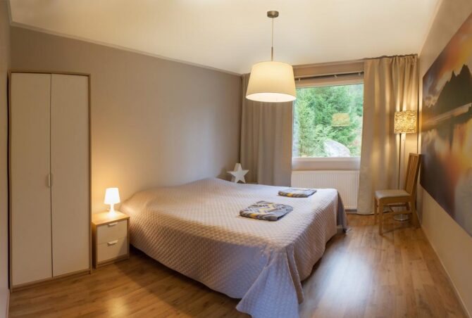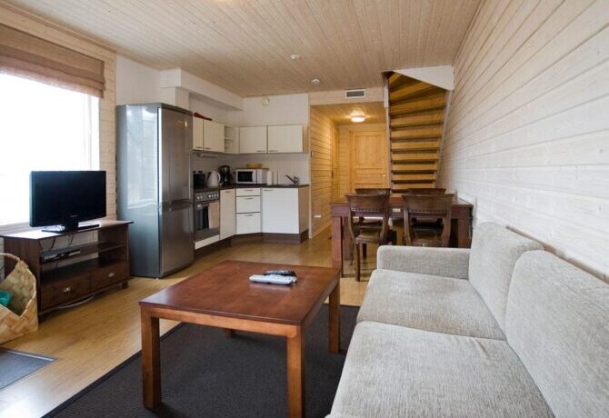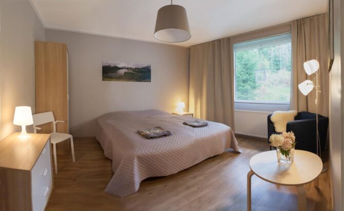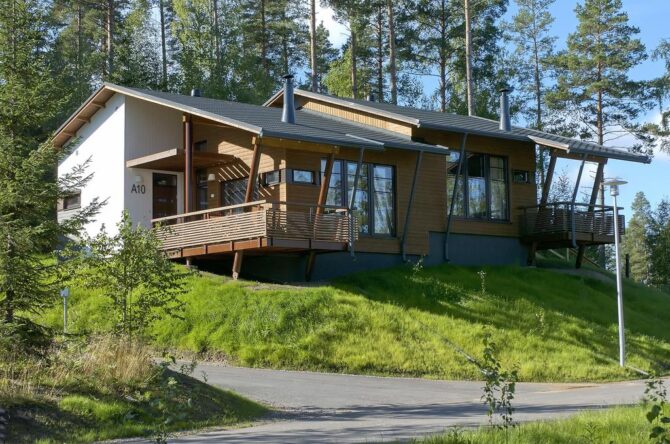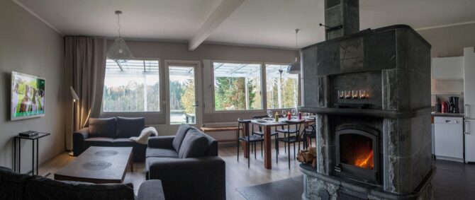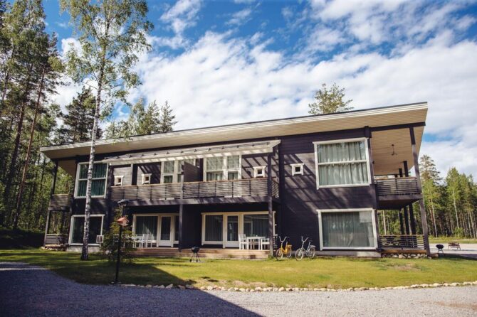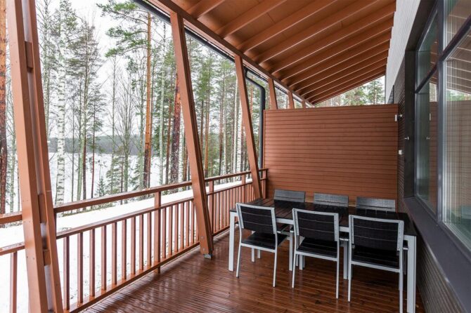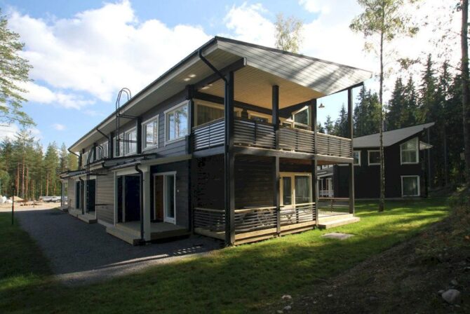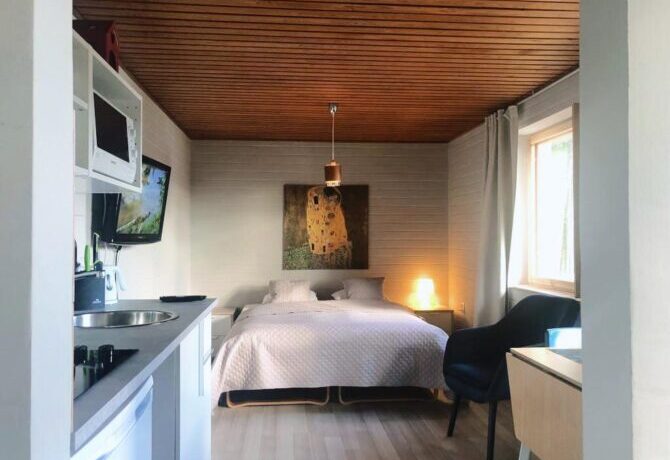 A 15-minute drive from Imatra, modern apartments are located right in the forest. The main partner is the hotel “Imatran Kylpyla Spa” located literally 400 meters away. It registers visitors. Vacationers can come here at any time to dine in a restaurant, swim in an indoor pool, visit the gym. And then go back to the apartment with its own terrace to plunge into the world of nature and silence.
