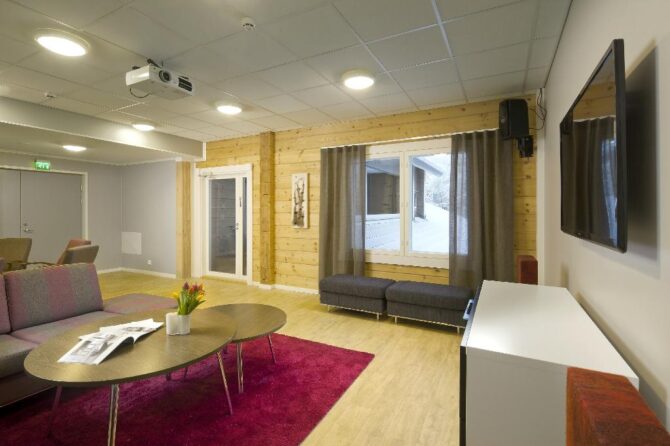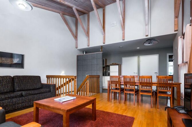 The realm of separate apartments – this is how you can call this hospitable hotel. It is located in a park area and consists of two-storey townhouses with their own saunas. Within walking distance there is access to the ski slope, tennis court. Literally 2 km away is the Ice Palace. The hotel cooperates with a travel agency engaged in the organization of outdoor recreation. Its employees have developed more than 50 hiking trails. They are also engaged in the rental of ski equipment, boats, bicycles.