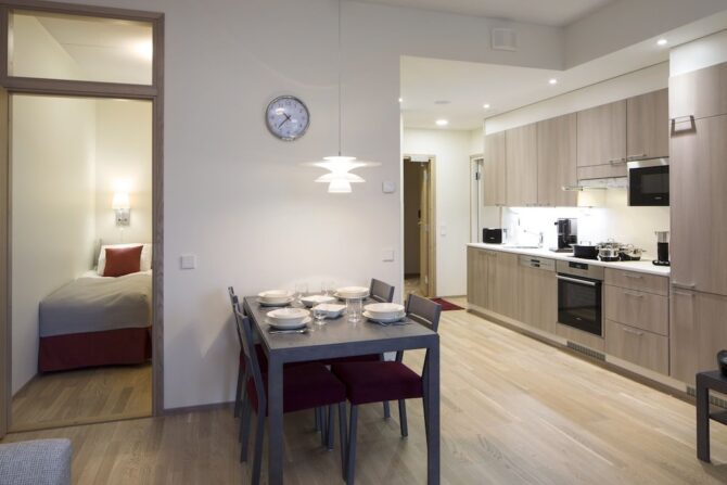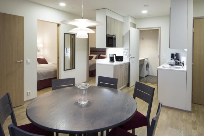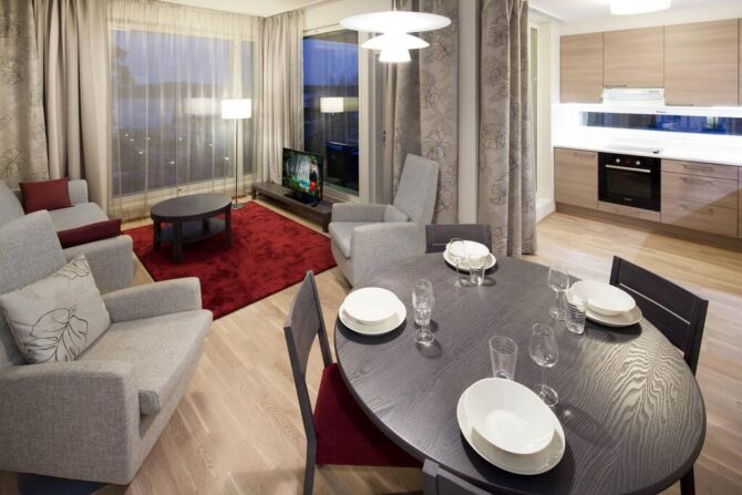 The apartments of the hotel complex are located in a natural area, a 10-minute drive from Imatra. Visitors rated the level of comfort and location at 8.6 points. It has its own restaurant, where you can order food with delivery. Spacious rooms, saunas, terraces for relaxation characterize this place. On-site activities include bicycle rental, fitness center, hiking trails, fishing. You can come here with pets.