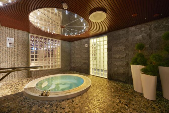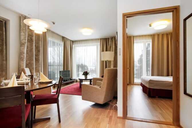 The best option for parents with children. The spahotel is located on the shores of Finland’s largest body of water, Lake Saimaa. Indoor swimming pool, water slides, restaurants, coffee shop, small shops are located right on the territory. A playground has been built for children, and access to the Magic Forest water park is free for all residents.