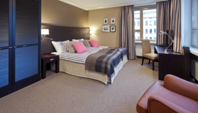 In the center of the city on the banks of the Vuoksi River rises a beautiful castle. It is connected by an underground tunnel to the modern building of the hotel. Rooms can be booked in any of the buildings. Couples in love like to come here. The infrastructure is created for a romantic holiday for two. Here you can swim in the indoor pool, steam in the Finnish sauna, lie on stone heated sun beds, take hot tubs. Tourists rate the level of comfort at 9.5 points.