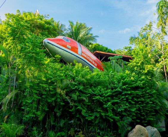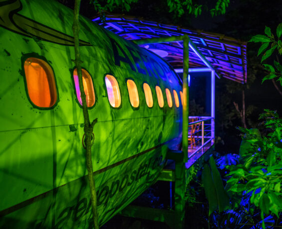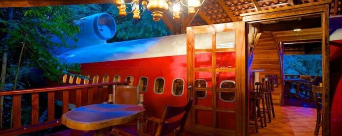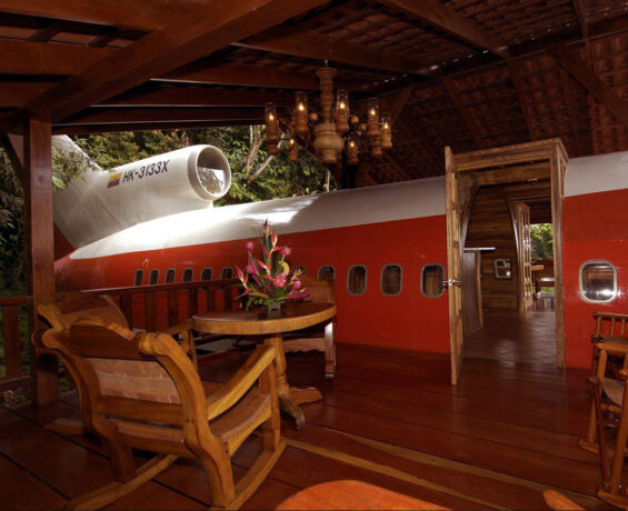 The hotel’s main feature is an exclusive hotel room housed in a vintage 1965 Boeing 727, which in its former life flew global flights for South Africa Air and Avianca Airlines (Colombia). It’s a fully equipped, meticulously designed, two-bedroom Boeing 727 fuselage that seems to fly out of the jungle dome, giving guests views that will make them feel like they’re flying. This airliner was rescued from eternal oblivion from San Jose airport. Not without the help of great designers, it has been resurrected into a unique giant hotel room. Located on the edge of a national park near Costa Verde II, this classic aircraft sits on a 50-foot pedestal.