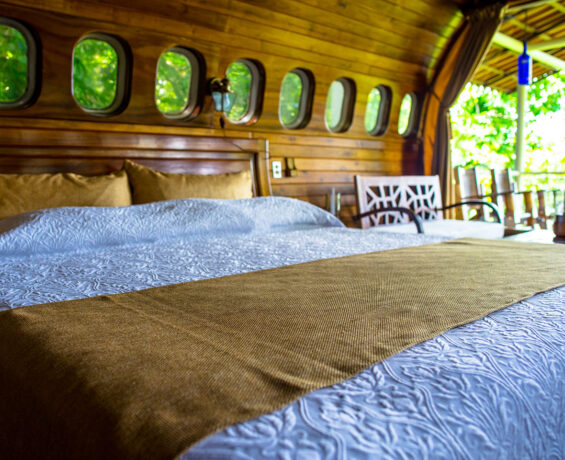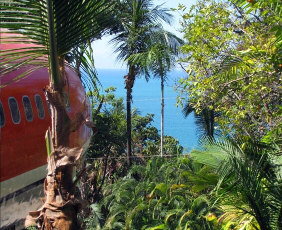 At this altitude, guests will enjoy scenic ocean and jungle views from a hardwood deck built over the former right wing of the plane. The interior of the aircraft is finished with handmade teak wood furniture from Java, Indonesia. There are two air-conditioned bedrooms – one with two King Size beds and the other with one King Size bed, each with private bathroom, flat screen TV, kitchenette with microwave, dining foyer, terrace with ocean views, private entrance up to the “river” rock, spiral staircase and 360 degree view.