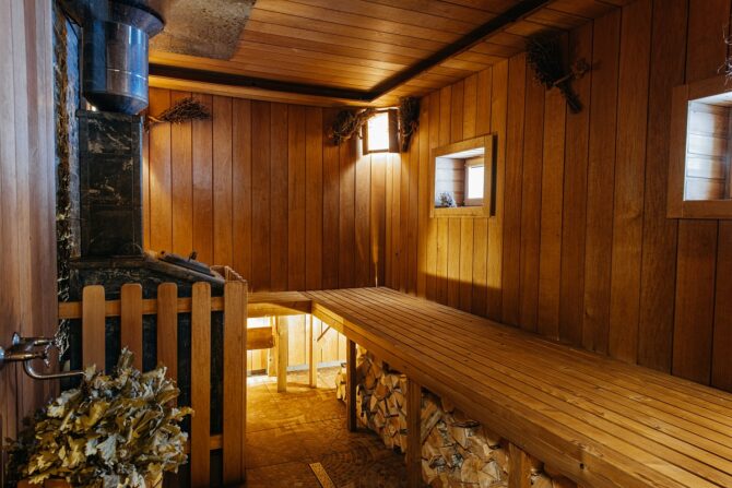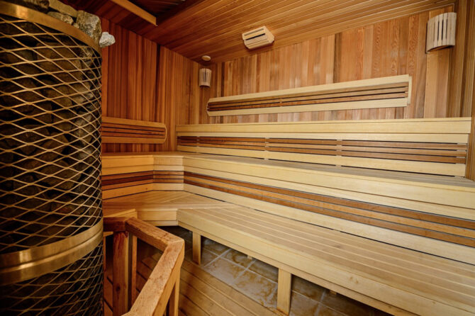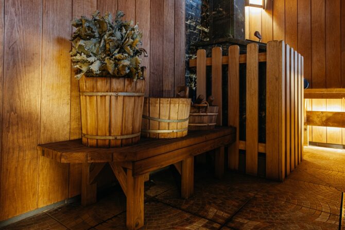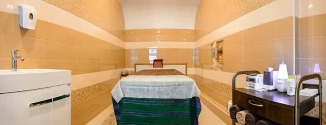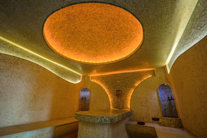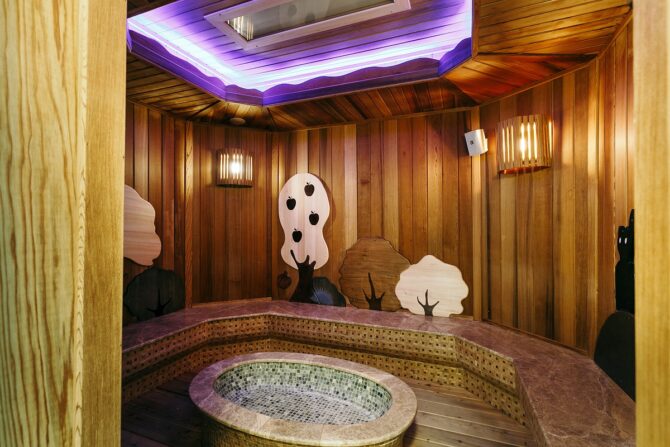 Steam rooms with a beautiful and high-quality interior will help cleanse the skin and lungs, relieve tension and restore tone. In addition to the familiar hammam and Finnish sauna, there is a salt sauna in the spirit of Soviet dispensaries, the walls of which are decorated with salt panels. It is believed that such inhalations have a beneficial effect on the skin and respiratory organs.