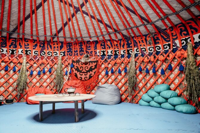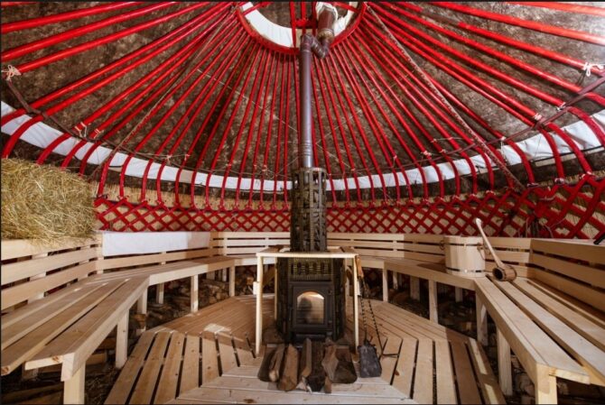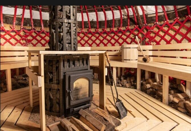 Yurt of nomads costs 3500r per hour and can accommodate up to 9 guests. In fact, these are two yurts: in one there is a steam room, in the other a place to relax with a fire. Next to the font with cold water. The steam room has the shape of a circle, where in the center of the stove is made of iron, and along the edges of the shelf. All this has a “shamanic” entourage so that guests feel like residents of the far north. After sitting in a yurt with steam and warming up well, you need to go to plunge into the font, then relax in the “yurt of masters”, practice “mastering the void” and inhale the aroma of wild herbs.