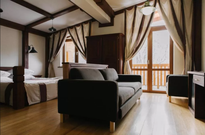 Rooms differ from each other in cost, area, comfort and are 1,2,3,4-bed. Decorated mainly in the style of “loft” or “chalet”. Equipped with everything you need: furniture, bathroom with shower, plasma with satellite TV, telephone, mini-bar, safe, hairdryer, slippers and bathrobe, tea set and bottled water.