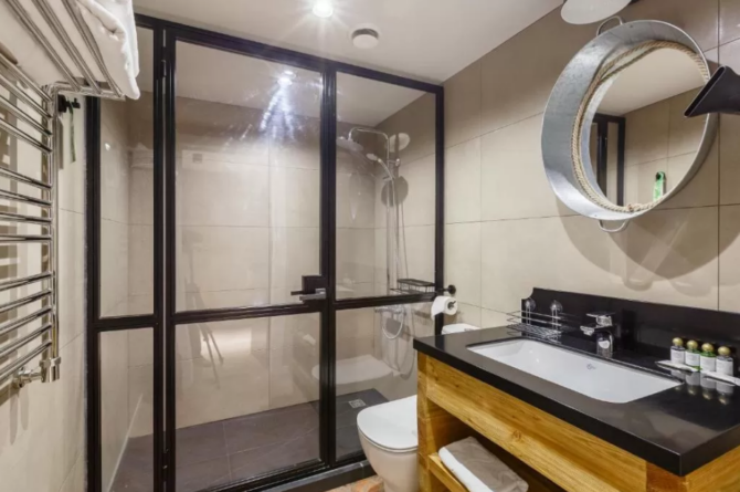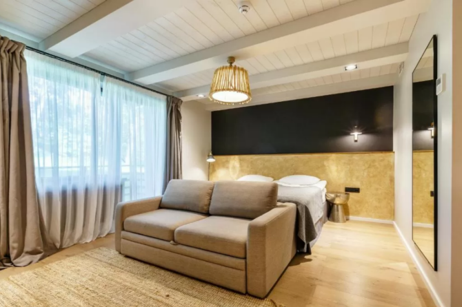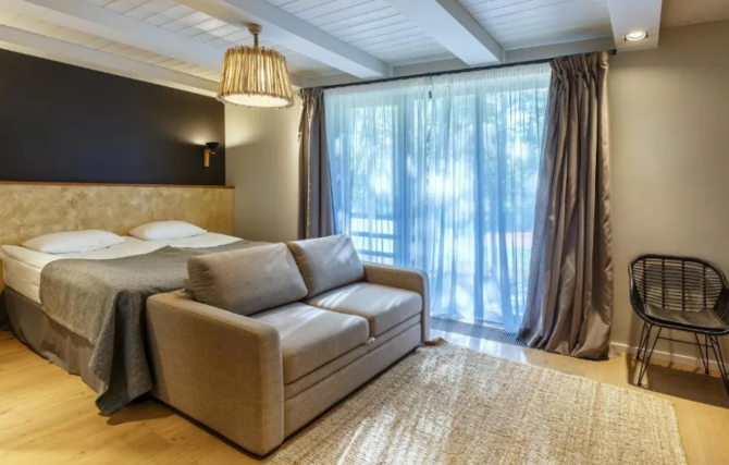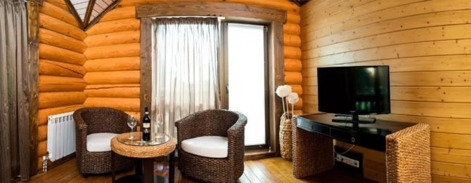 The most convenient and expensive option: rent a cottage with friends. Each such house includes several bedrooms, a living room, a kitchen, a bathroom with a shower. The design is modern, the decoration under the tree, the volumetric spaces have to rest.