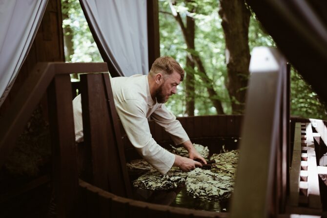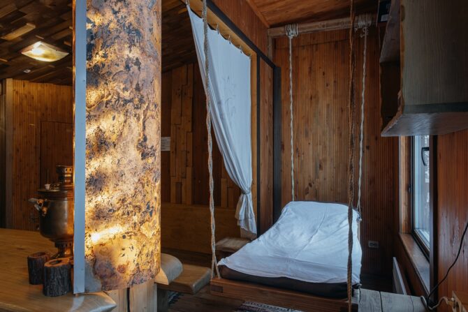 Here’s how Evgeny, an office worker from Moscow, describes the place: “what to do: walks along the eco-trail to the beach on Tarusa, where there are swings in the trees, bungees, apiary and clean air. On the site “forest” trampoline and hammocks, in the evening cartoons and gatherings around the fire. There are still master classes, baths, fishing, but we had enough forest and walks. The service is better than in other similar country hotels closer to the Moscow Ring Road. I will add quality food here. This place has conquered us!”