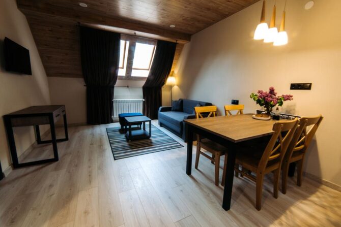 It offers stylish rooms with all the necessary household and digital appliances, and many regular customers book in advance spacious apartments with a living room and kitchen to feel like a cozy cottage away from the city noise.