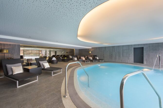 This modern Alpine hotel is located in the heart of the resort. Guests are settled in comfortable rooms of standard, family, junior suite and suite. Extra beds are not available. Parking is paid – 49 Swiss francs per day. It offers a restaurant serving local cuisine, a spa, an indoor pool, a heated outdoor pool. There is a cable car station 100 metres from the entrance. Breakfast is served in the morning. During the day, à la carte meals can be enjoyed at the restaurant, sushi bar, tapas bar or café. The Away Spa and modern gym are free of charge. A concierge is on duty on the floors around the clock.