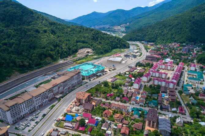 Krasnaya Polyana is not only the name of the ski resort, which actually includes several peaks, but also the village, which is located at an altitude of more than 500 meters above sea level. The place is very picturesque for permanent and temporary residence: it is crossed by the unhurried river Mzymta, closed from the winds of the mountain.