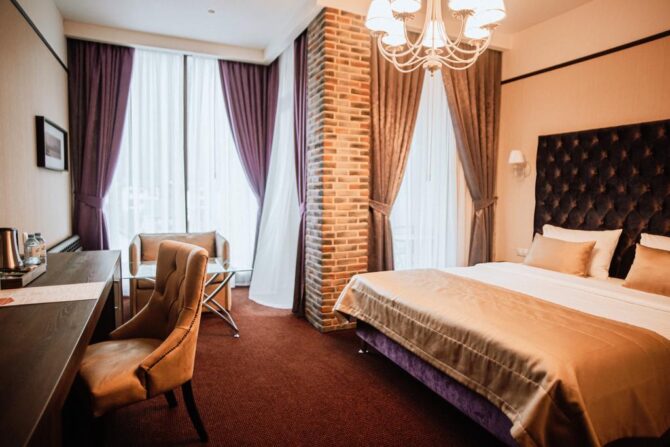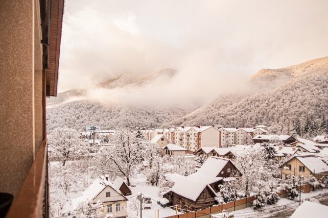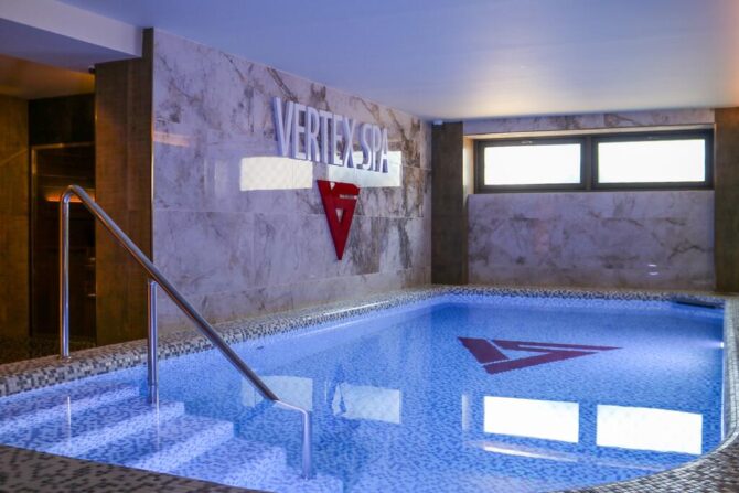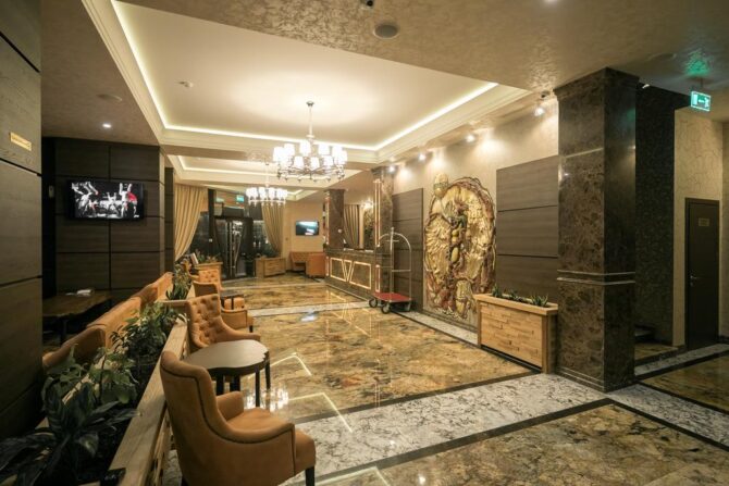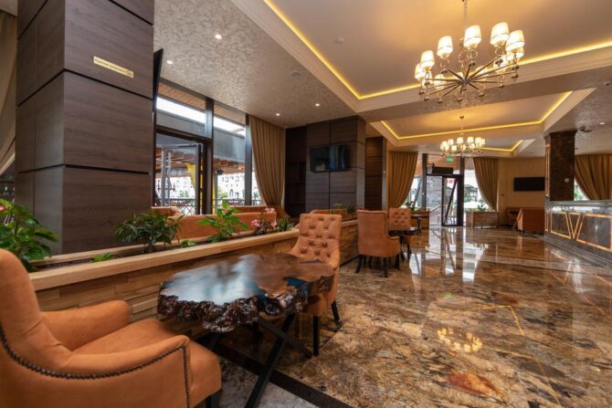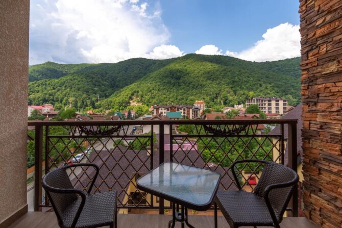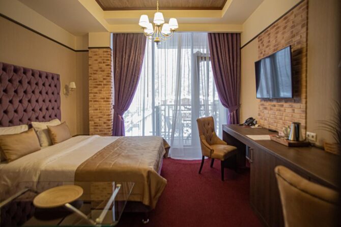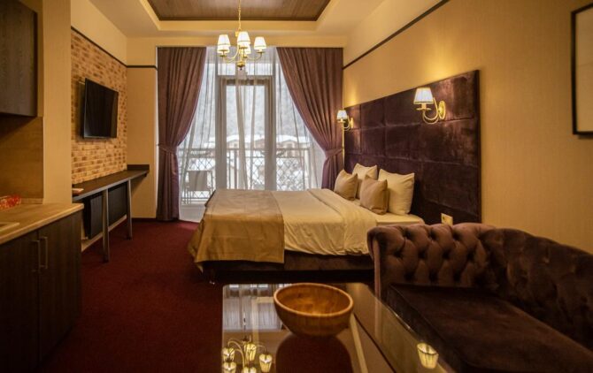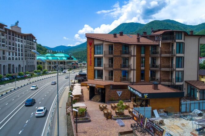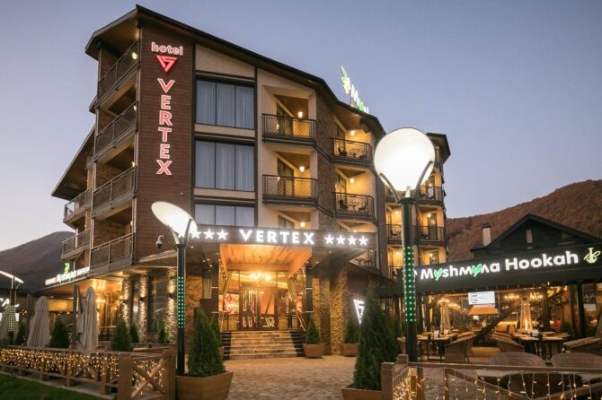 Luxury spa hotel “Vertex” with its own casino is located two kilometers from the mountain lifts and an hour’s drive to the international airport of Sochi. The hotel building looks stylish and modern, and all the interiors are made in calm colors of marble, onyx and wood. In total, there are about 50 rooms of various categories, everywhere a cozy home atmosphere is created. The hotel is low – only 5 floors, but all the windows offer breathtaking views of the Caucasus Mountains.
