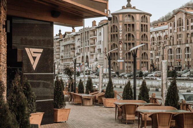 Let’s talk in more detail about another village near Krasnaya Polyana with the rare name Esto – Sadok,in which there are many hotels. It belongs to the resort of Gorki Gorod, which is conditionally divided into two parts, different in altitude above sea level – 540 and 960 meters. All the basic infrastructure and entertainment is located at the bottom. Here you will choose a café and restaurant to your liking, walk along the central square of the village. There is also a large shopping center with a supermarket, fast food outlets and a water park. Guests of hotels on the lower level can climb “up” an unlimited number of times with the guest’s key.