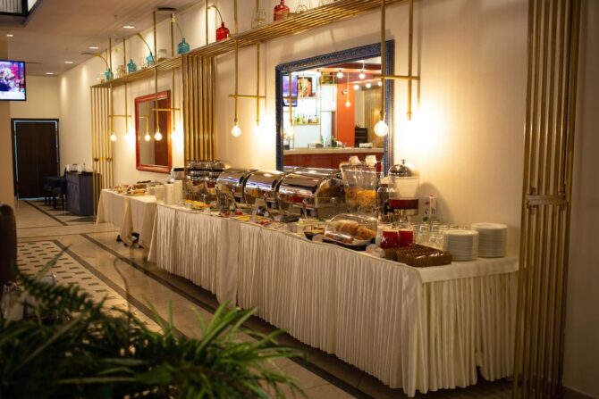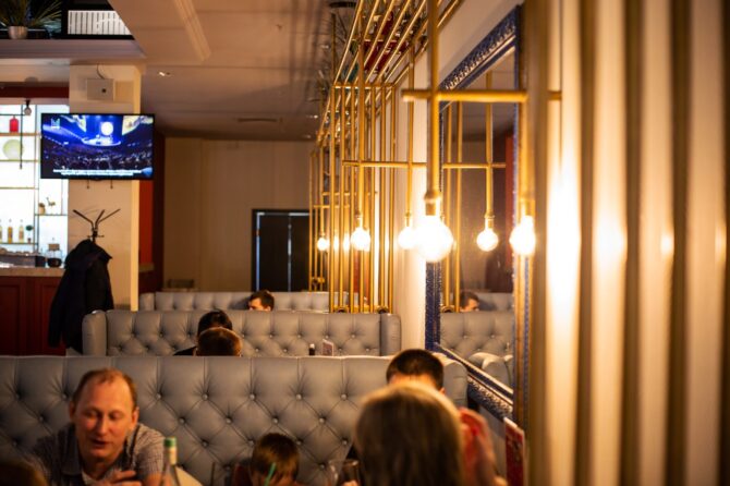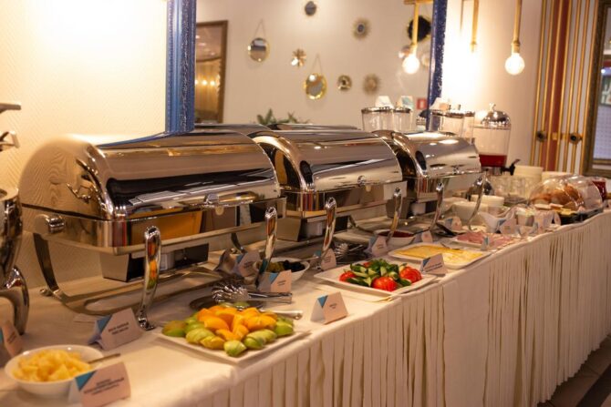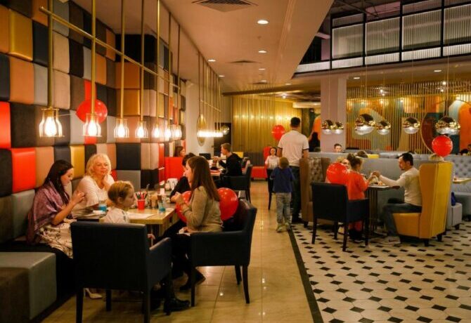 Guests are served by two catering outlets. One of them – café “7ya” – is focused on parents with children. Breakfast is served from 7.00 to 11.00. From 12.00 to 16.00 – time for business lunch. The menu is developed for every day. It is convenient that there are several names of salads, soups, hot dishes, desserts and drinks to choose from. On average, you can have lunch for 200-250 rubles (actual for February [y]). In the evening, the café serves a table for dinner. The brand chef likes to surprise guests with new items on the menu. For example, the “Pan-Asian menu” category was recently added.