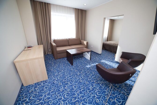- VIP suite (45 sq. m.). Two-room suites of this category are located on the 10th floor of the hotel. They are equipped with premium furniture, corner bath, kitchenette (microwave, refrigerator, coffee machine, dishes).