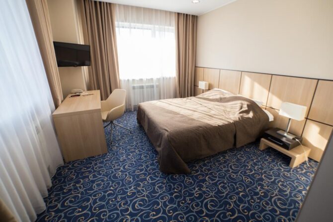 - VIP standard (21 sq. m.). Rooms are located on the 10th floor. The room has a King size bed. Free services are available in the form of access to the fitness club, laundry, “room-service” (delivery of food and drinks to the room).