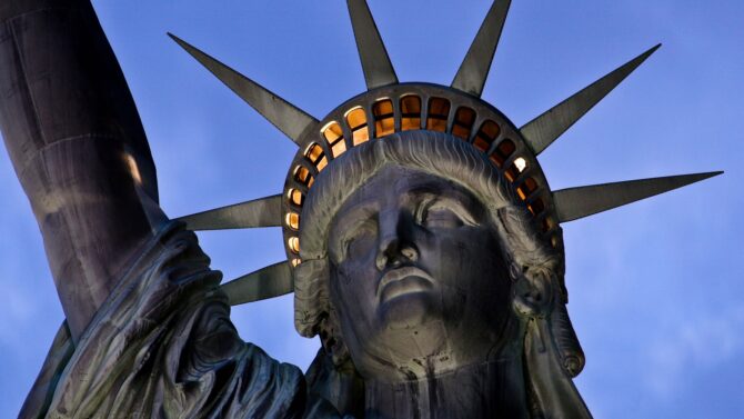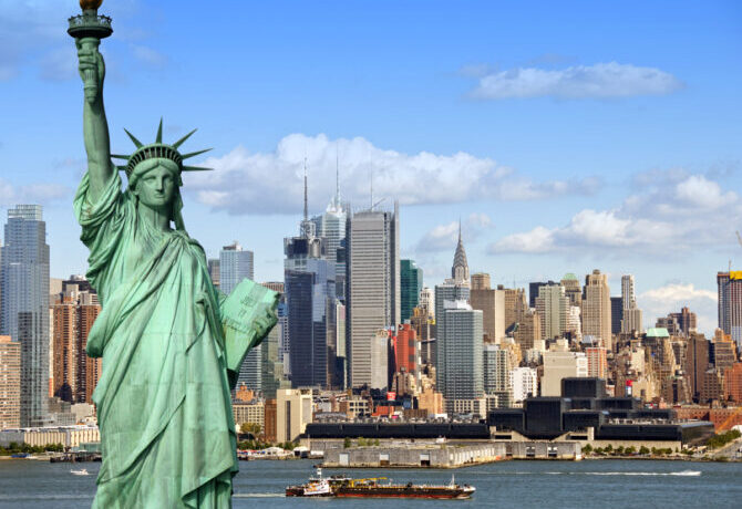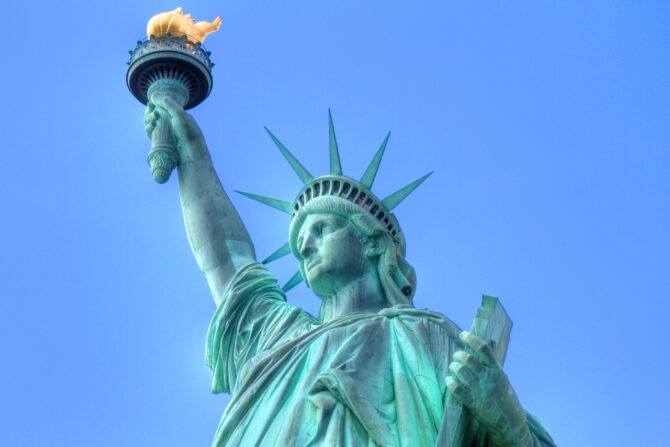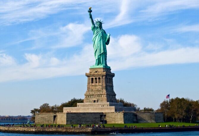 The Statue of Liberty is a famous symbol of New York and American independence. This is a legendary monument, which every American is proud of. The height of the monument is 93 meters. The statue of a woman holding a torch in one hand and a plaque with the date of the country’s independence in the other is visible from afar, and in the evening and at night it is illuminated by many lights.