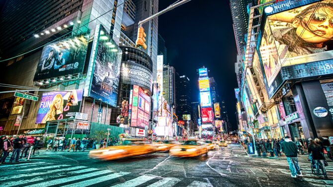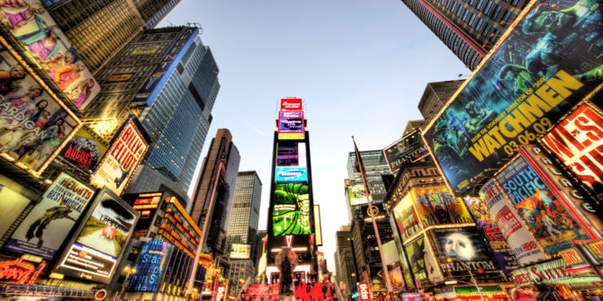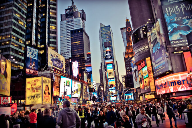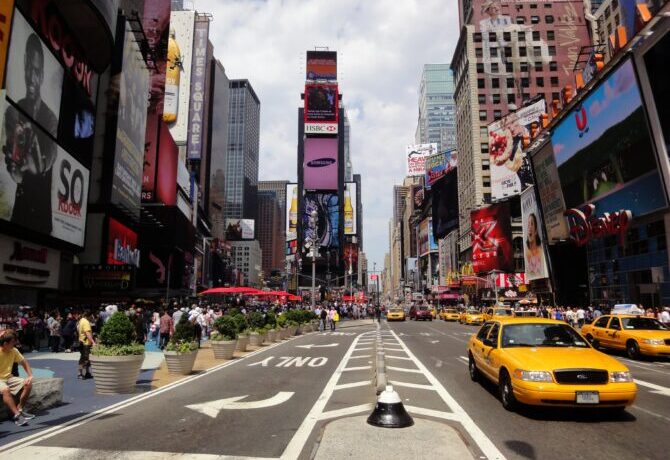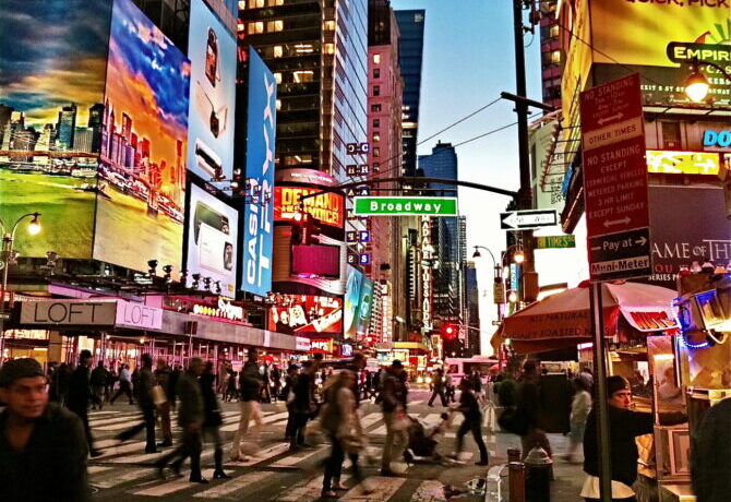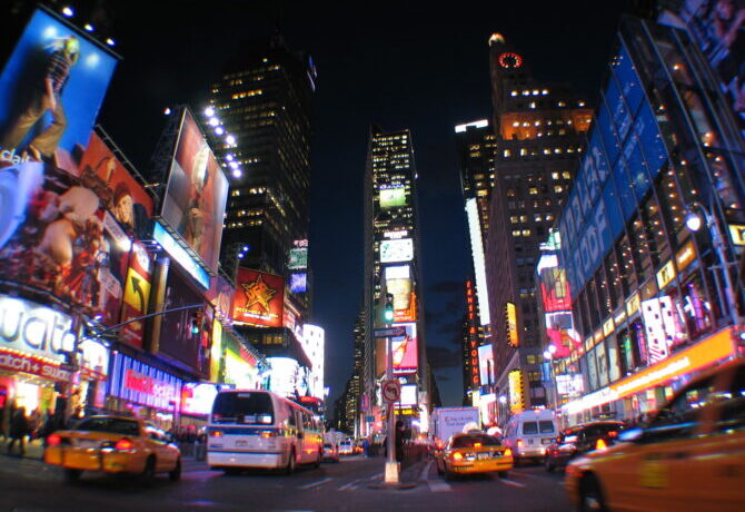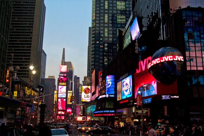 Every day in Times Square there are about 300 thousand residents and tourists, about 40 million people pass through it annually. The famous street with its advertising lights and skyscrapers is located at the intersection of Broadway and Seventh Avenue.