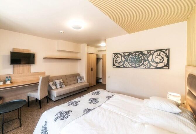 The rooms have everything you need for a comfortable stay, and if something is missing, the staff working around the clock will come to the rescue. It offers a restaurant and bar, ample parking, bicycle storage and ski equipment, and free Wi-Fi throughout. Unfortunately, pets are not allowed, but childcare is organized at the highest level.