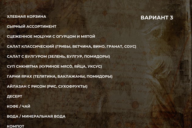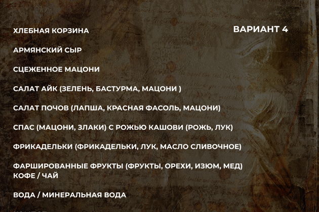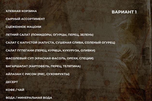 В уютном пространстве вам предложат изысканный ужин от известного шеф-повара, который ищет забытые рецепты по всей Армении. Вы погрузитесь в атмосферу традиционной армянской культуры, ощутите великолепные ароматы и вкусы. Гастрономические впечатления останутся с вами навсегда! Вы насладитесь ужином в месте, где бывали Конан О’Брайен и Ким Кардашьян.