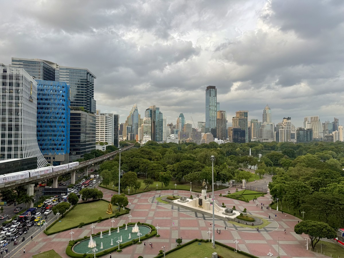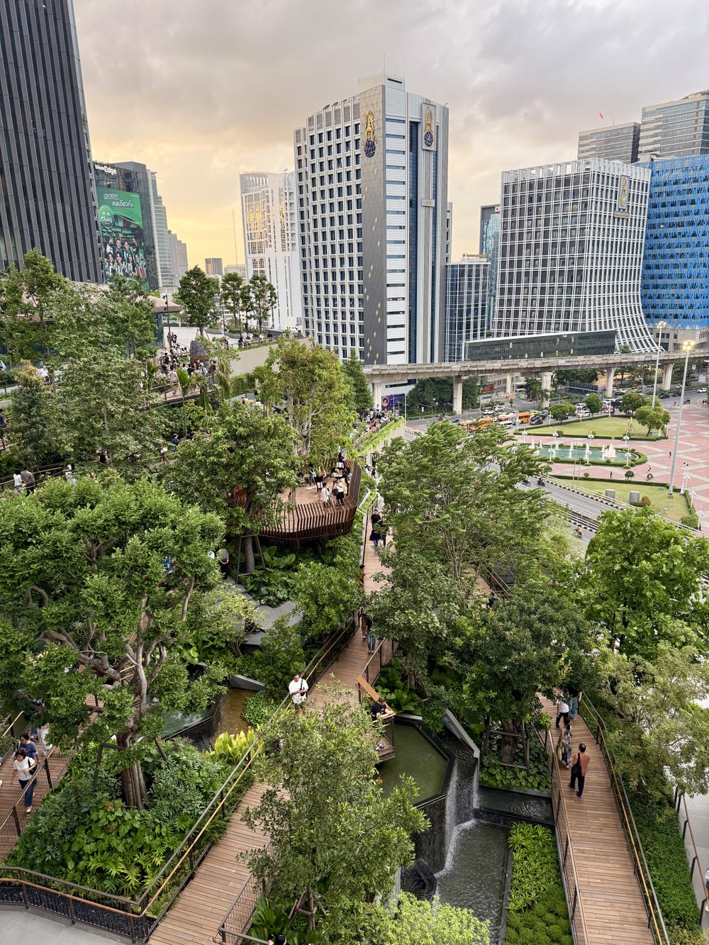 Смотровая площадка Central Park (Силом). Современное городское пространство с зелёными дорожками, водопадами и уютными террасами. Отсюда открываются потрясающие виды на парк «Люмпини» и небоскрёбы Бангкока — идеальное место для фото.