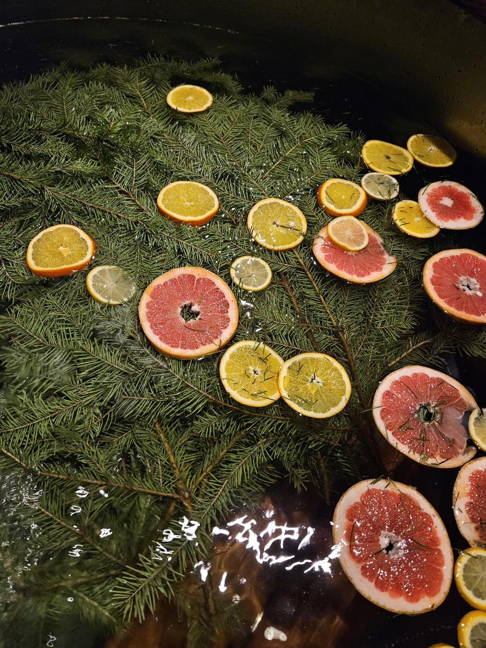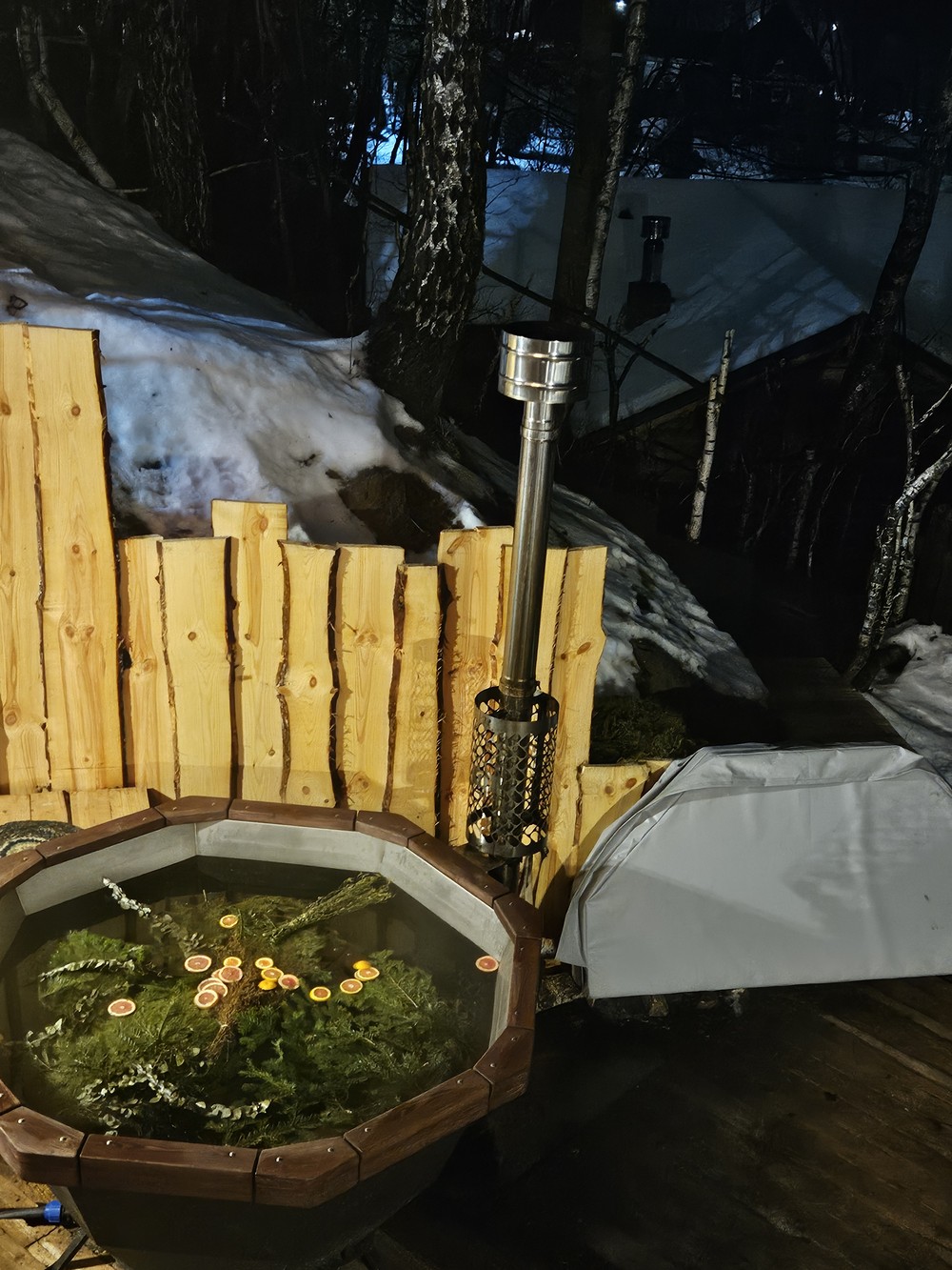 Холодная и тёплая купели с видами на живописный лес. Покупаетесь в чане с еловыми ветками и ароматной пихтой, словно в супе у Бабы-яги. Насладитесь красотой неба, отражающегося в воде.