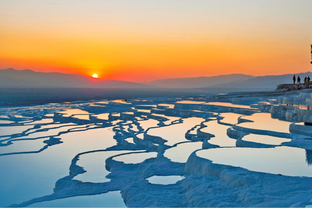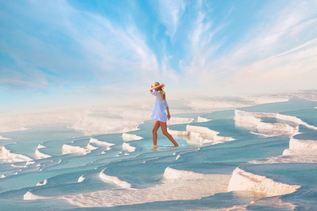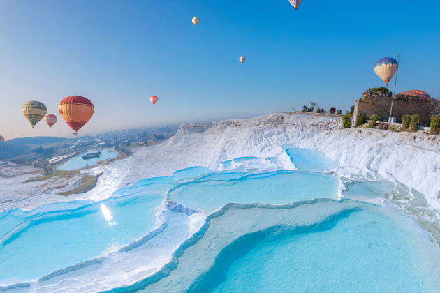 Памуккале, или «хлопковый замок», — природное чудо, признанное объектом ЮНЕСКО в 1988 году. Белоснежные террасы с травертинами напоминают застывшие водопады, а их бассейны наполнены теплой голубой водой с целебными свойствами. Вода улучшает кожу, расслабляет и заряжает энергией.