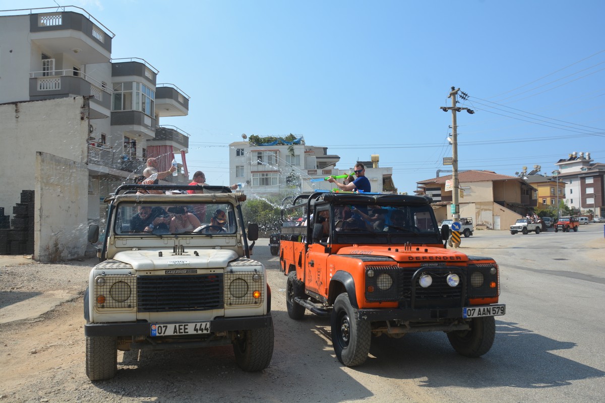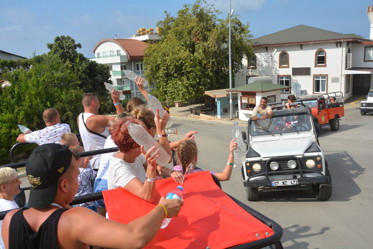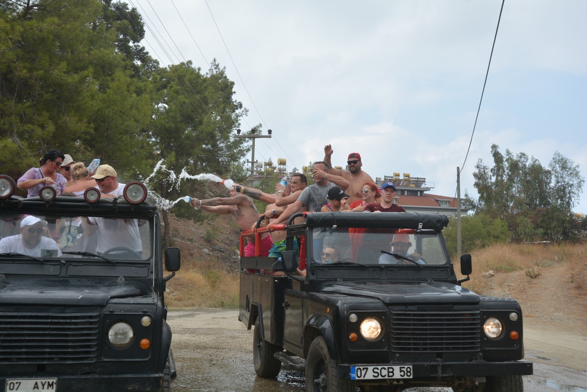 И так друзья немного опишу экскурсию, что и как. В целом сразу надо настроится на позитивный лад так как будут небольшие нюансы, но правильный настрой поможет все сгладить. Вас заберут из отеля на джипе с открытым верхом такого архаичного вида, но оно так и надо потому что его будут заливать водой со всех сторон. Но с точки зрения безопасности - держитесь крепче)) я был с сыном (6 лет), всегда его придерживал. Да и в целом в Турции движение специфичное. Пока едете от отеля до точки сбора на заправке испытаете на себе все свойства аэродинамики. В наш джип вместилось около 10-11 человек, плотнячком, но норм. На заправке вам выдадут вотерганы (по желанию), но за доп плату 5 долларов за один ствол. Конечно, надо их брать, мы только ради этого и поехали, сын никак не мог дождаться, когда выдадут пушку. В общем поехали дальше, команда у нас собралась интернациональная, из русских только мы вдвоем были, а из всей колонны порядка 7 машин, еще было пару девушек русских. Ну тут рандом. Главное чтобы душнил никаких не попалось, чтобы все кайфовали. Далее вы едете на точку, где открывается неплохой вид, по пути расстреливая друг друга, это достаточно весело и эмоционально. Следующая остановка в небольшом парке у водопада. Там такое беспризорное место в целом. Все такое «советское», но горка классная. Мы с нее вместе с сыном несколько раз скатились в холодную водичку. Тоже очень понравилось. Там купили кофе турецкий и чипсы по 3 доллара за позицию, немножко взбодриться и перекусить. Там вся локация в тени, поэтому может быть чуть прохладно после обильного обливания и купания. Лучше чтобы полотенце было с собой. Следующая остановка рынок у дороги. Там вам дадут продегустировать разные фрукты, орешки. Так больше символический небольшой перекус. Апельсиновый фреш стандарт 2 доллара стакан. Потом вы поедете в пещеру. Локация там с красивым панорамным видом, можно пофоткаться. Есть бесплатный нормальный туалет. В пещеру вход стоил 6,5 доллара, дали сдачу 50 центов. Ребенка пустили бесплатно. Пещера интересная, но наверное на разок. Я не разу не был в подобных местах, было интересно глянуть. Сыну очень понравилось. Там минут 20-30 за глаза. Потом вы поедете на обед в достаточно простенькую локацию, но там тоже есть бассейн с обычной водой уже и горками. Сын по классике не вылезал из воды. Там вас покормят. Обед обычный макарошки или булгур и шашлык куриный. Ну и всякие добавки по мелочи. Кофе там 3 доллара. Взрослые поедят норм, сыну же все было остро и макароны и шашлык. Поел яблочко, взяли с собой. Там уже можно переодеться в сухую одежду, обливаться больше не будете. Также вам предложат за 20$ фото/видео материалы за всю дорогу, что вас снимали. Скинут ссылку на Гугл диск. Гид Мустафа ровный тип с юморком и хорошим настроением. Добряк, который много делает для создания благополучной атмосферы. Затем вас отвезут назад в отель. Наш отель был самый первый в экскурсии и самый последний, когда везли назад. Сын благополучно уснул. Все прошло хорошо. Подведя итоги, можно сказать, что это хорошая экскурсия за свои деньги. Но нужно правильно настроится так как по мелочи тут сям моментики есть. Но главное наслаждаться процессом. Рекомендую 👍🤝 Ребятам, спасибо.