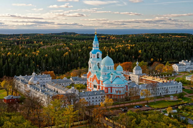 Экскурсия по острову Валаам начнется с подъема по святой лестнице на гору Фавор, здесь у ограды открывается панорама монастыря, монастырского сада у подножия, Монастырской бухты, куда заходят теплоходы из Ладоги. Памятный знак Императору Александру I, который был на Валааме. Рассказ о Знаменской часовне и проход Святые врата в монастырское каре, осмотр жилых келейных корпусов. Посещение отреставрированного Свято-Преображенского собора — главного сокровища и достопримечательности острова.