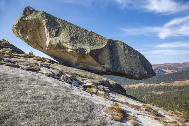 Он располагается недалеко от трассы Р-257, а само путешествие займёт всего несколько часов. Висячий камень — это глыба большой скалы, отколовшейся тысячи лет назад и висящей на краю километровой пропасти, над оз. Радужное.