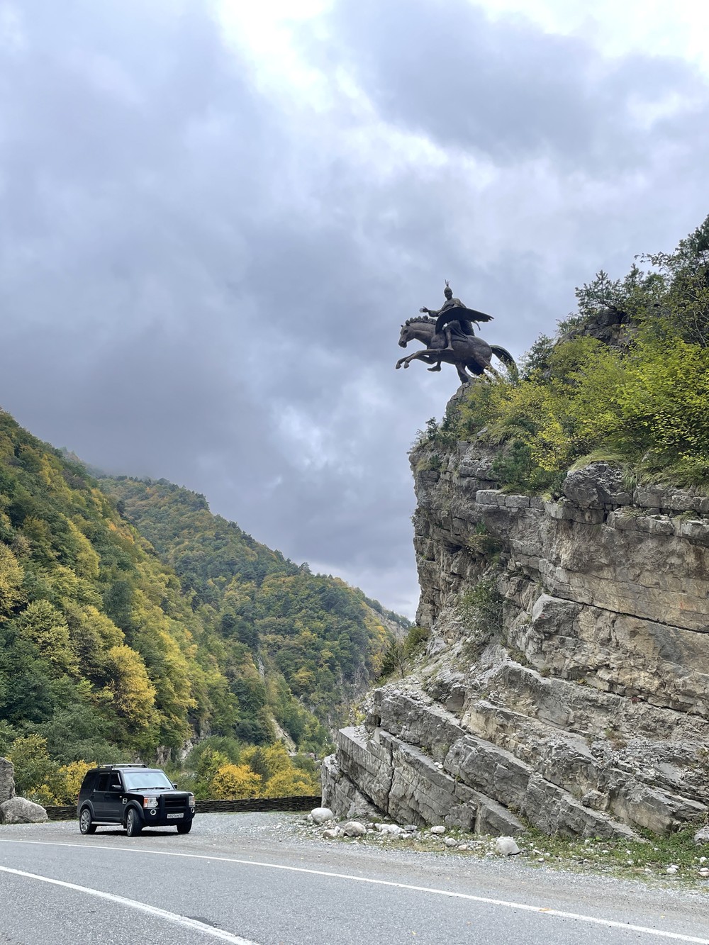 Памятник Уастырджи. В Алагирском ущелье вы увидите священную фигуру воина, словно выпрыгивающего на коне из отвесной огромной скалы и буквально парящего над дорогой.