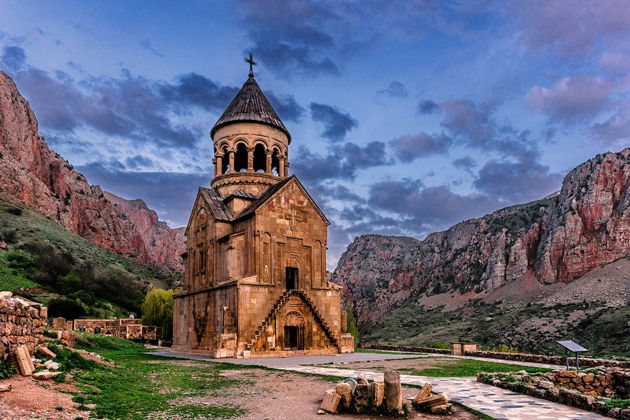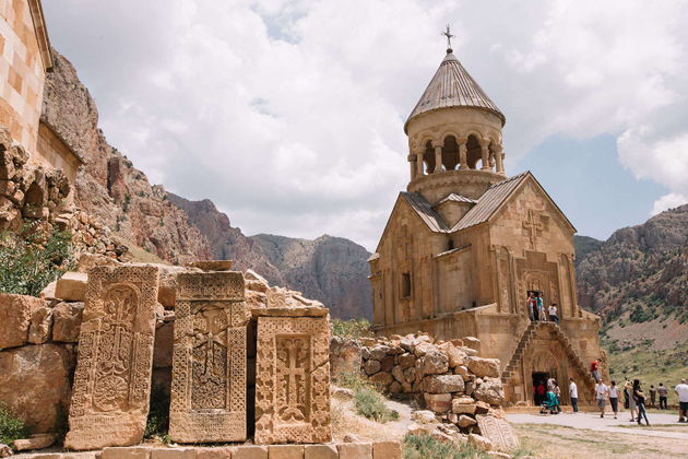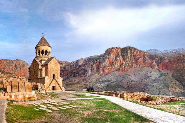 Монастырский комплекс Нораванк — жемчужина армянской религиозной архитектуры. Расположенный в 120 км от Еревана, он привлекает туристов церквями 13 века на фоне неземных пейзажей — отвесных красных скал ущелья реки Арпа в поселке Джермук.