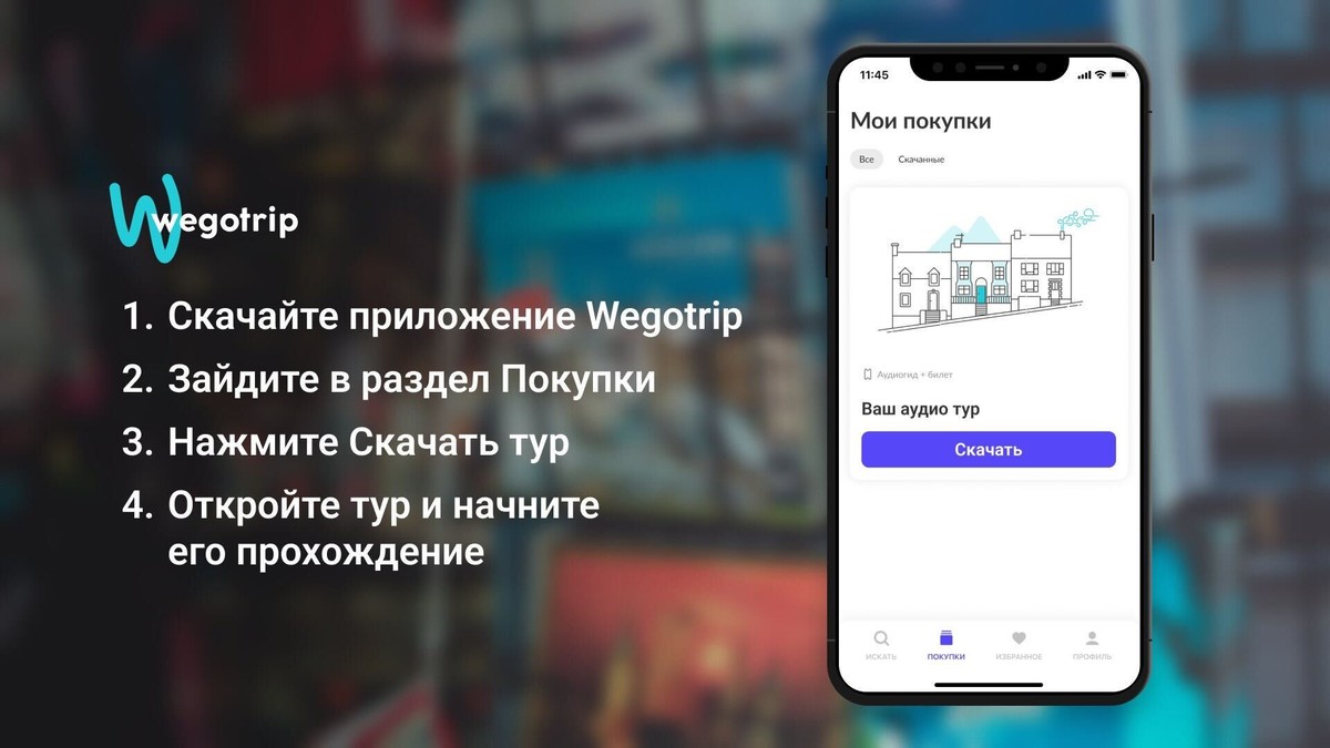 - После бронирования и оплаты экскурсии вы получите e-mail и смс со ссылкой на приложение и скачивание экскурсии с билетом