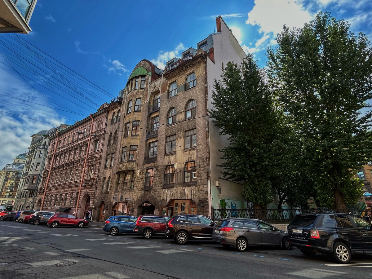 - Дом Бассейного товарищества — один из самых комфортабельных, крупных и технологичных домов города, выполнен на пограничье двух стилей — северного модерна и ар-деко. Побродим по горному ущелью внутреннего двора, побываем в парадной, увидим дореволюционное новшество — шахту лифта на чёрной лестнице