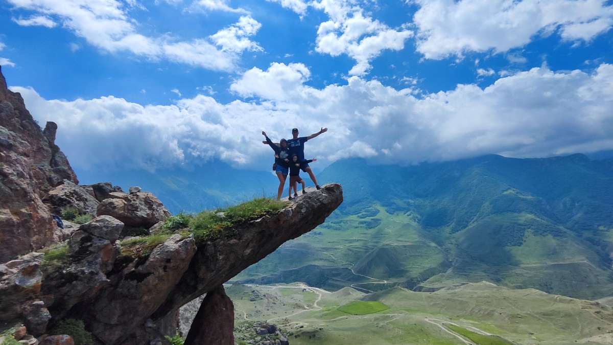 - Безенгийский «Язык Тролля». Сделаем самые захватывающие и экстремальные фото и видео с высоты птичьего полёта на камне в пропасть. Увидим заброшенные посёлки и древний замок с интересной легендой. А также попробуем самый вкусный шашлык из баранины, курицы или др. местное меню от местных жителей.