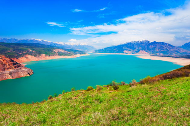 • Чарвакское водохранилище — бирюзовое сердце гор, куда мы заглянем с обзорной площадки или спустимся к пляжу.