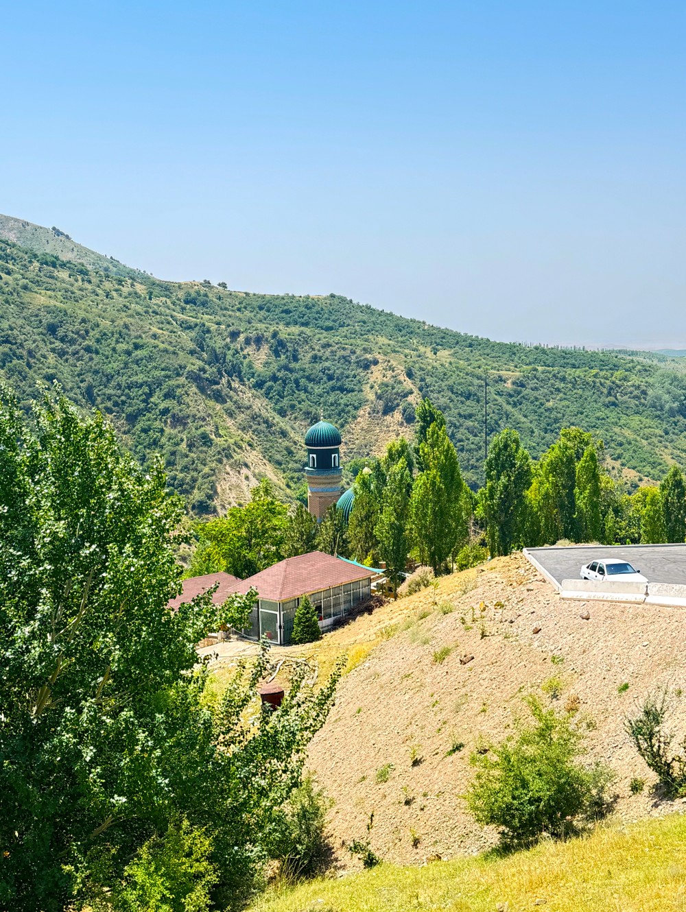 Прогулка по территории мечети, отдых у чинары и источника, фотопауза с видом на горы.