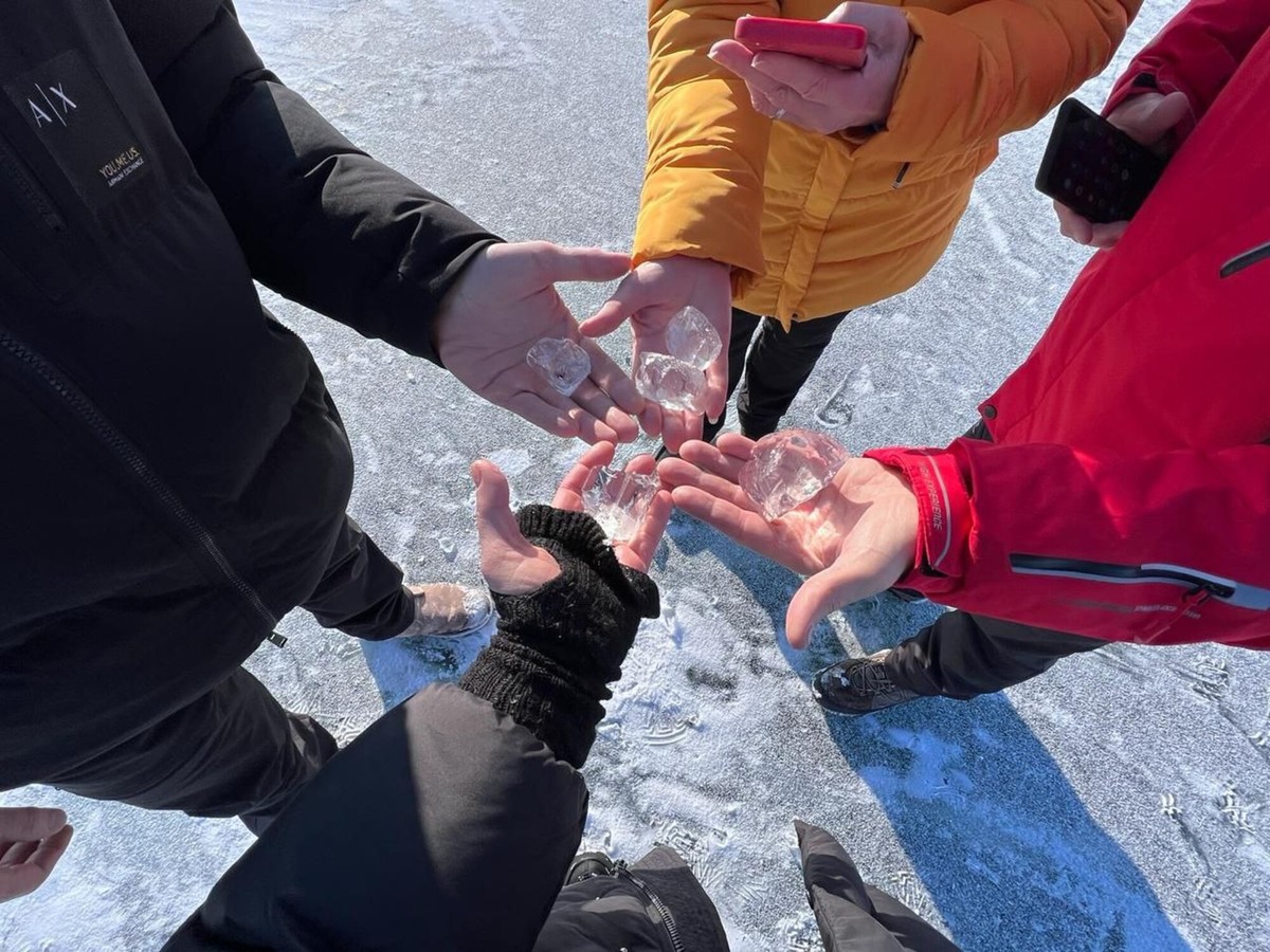 10:30 — переезд на хивусе или УАЗе по льду Байкала в сторону острова Ольхон. Мы остановимся на половине пути над самым глубоким местом озера. Ледобуром вырежем прорубь, попробуем чистую воду Байкала и сфотографируемся в торосах